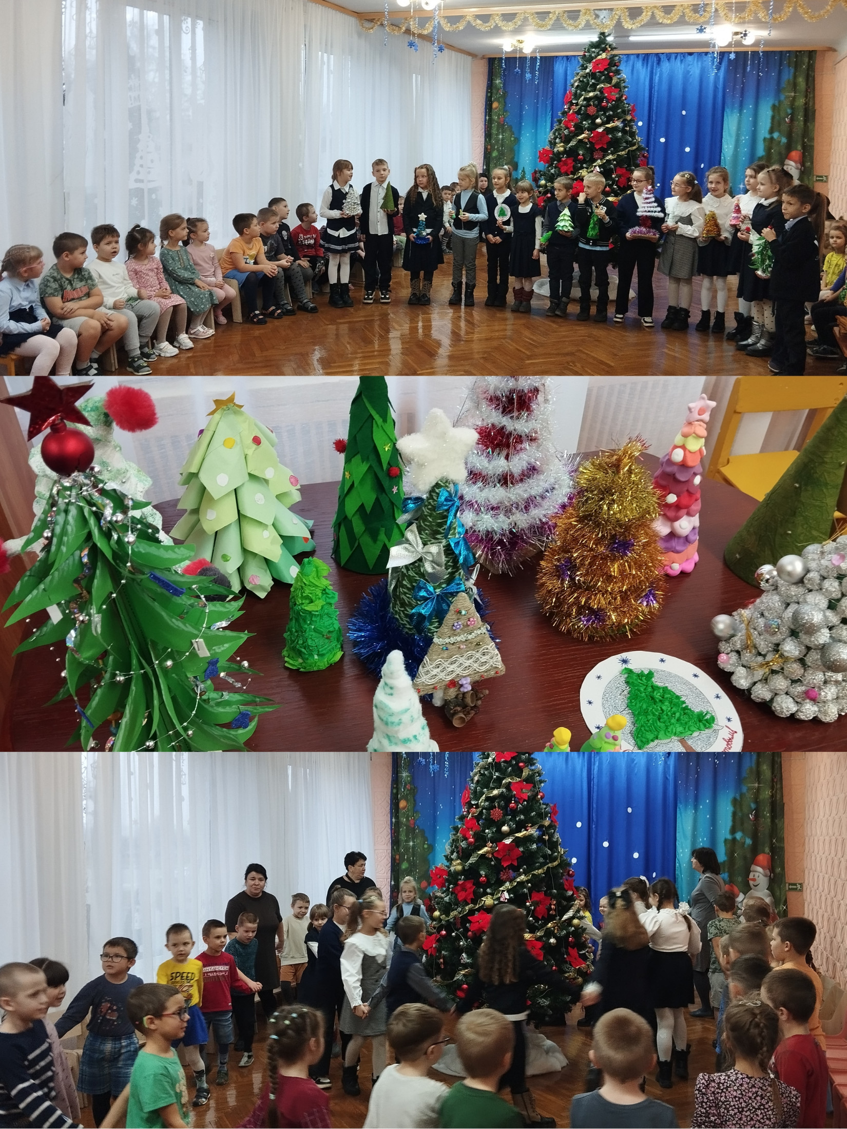 Но как обойтись без хороводов? Вместе ребята организовали два больших хоровода, весело исполняли новогодние песни, играли и плясали под лесной красавицей. На память школьники оставили свои елочки, которые займут место на выставке организованной в спортивно-музыкальном зале и будут радовать своей красотой и воспитанников, и их родителей.